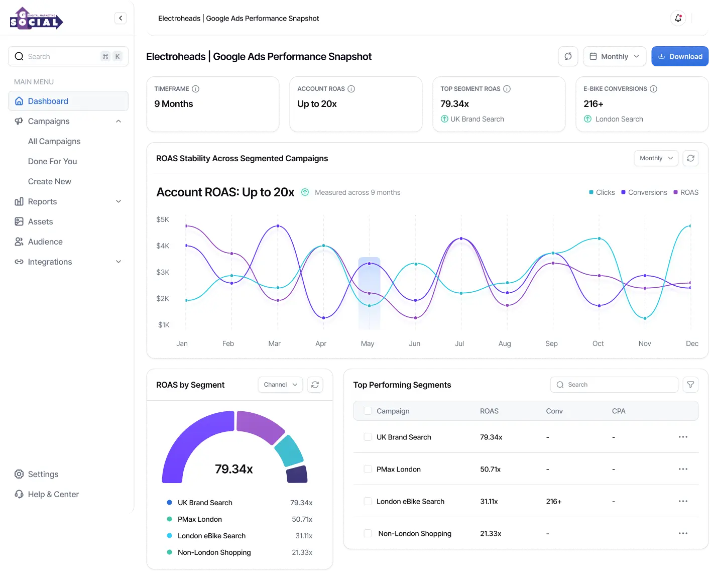 Within nine months, the account scaled to a consistent 20 ROAS across Google Ads, with performance delivered across segmented campaign structures rather than a single spike, ensuring scale was controlled and repeatable.